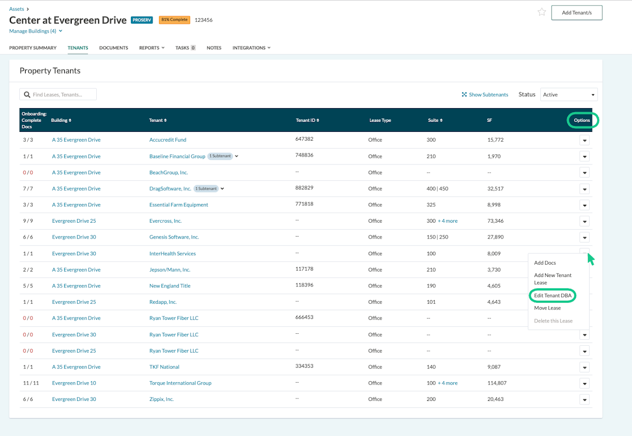 Click the dropdown arrow located on the right side of the window under Options and select Edit Tenant DBA