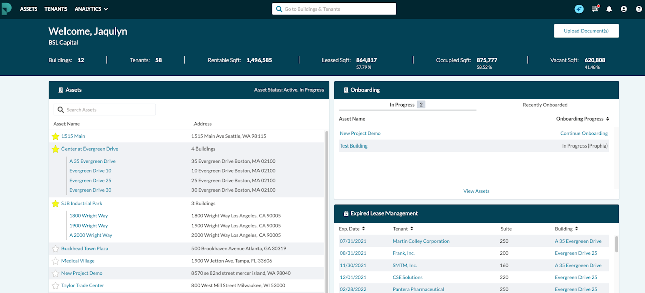 Upon logging into Prophia, you will see your customizable landing/home page where you can access your portfolio of assets, reporting tools and onboarding projects as well as view tasks and critical date notifications.