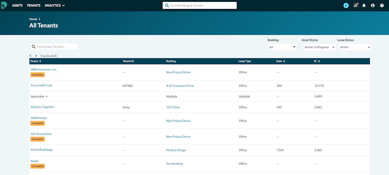 From the top navigation bar, clicking Tenants will take you to a master list of all your tenants and subtenants across all assets in your portfolio.